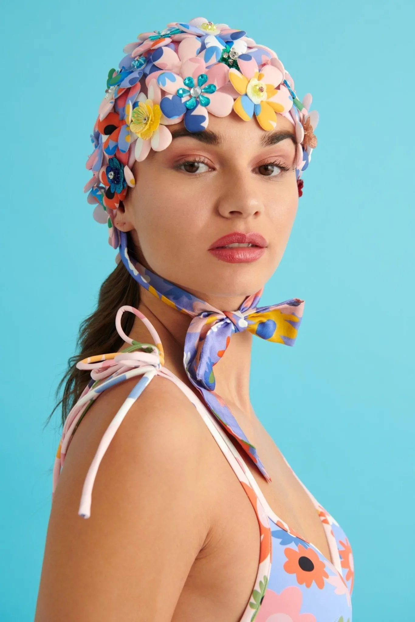 Blue Swimsuit With Colorful Flowers And A Flattering V-Neckline And Thin Straps. Perfect For Any Pool-Party.