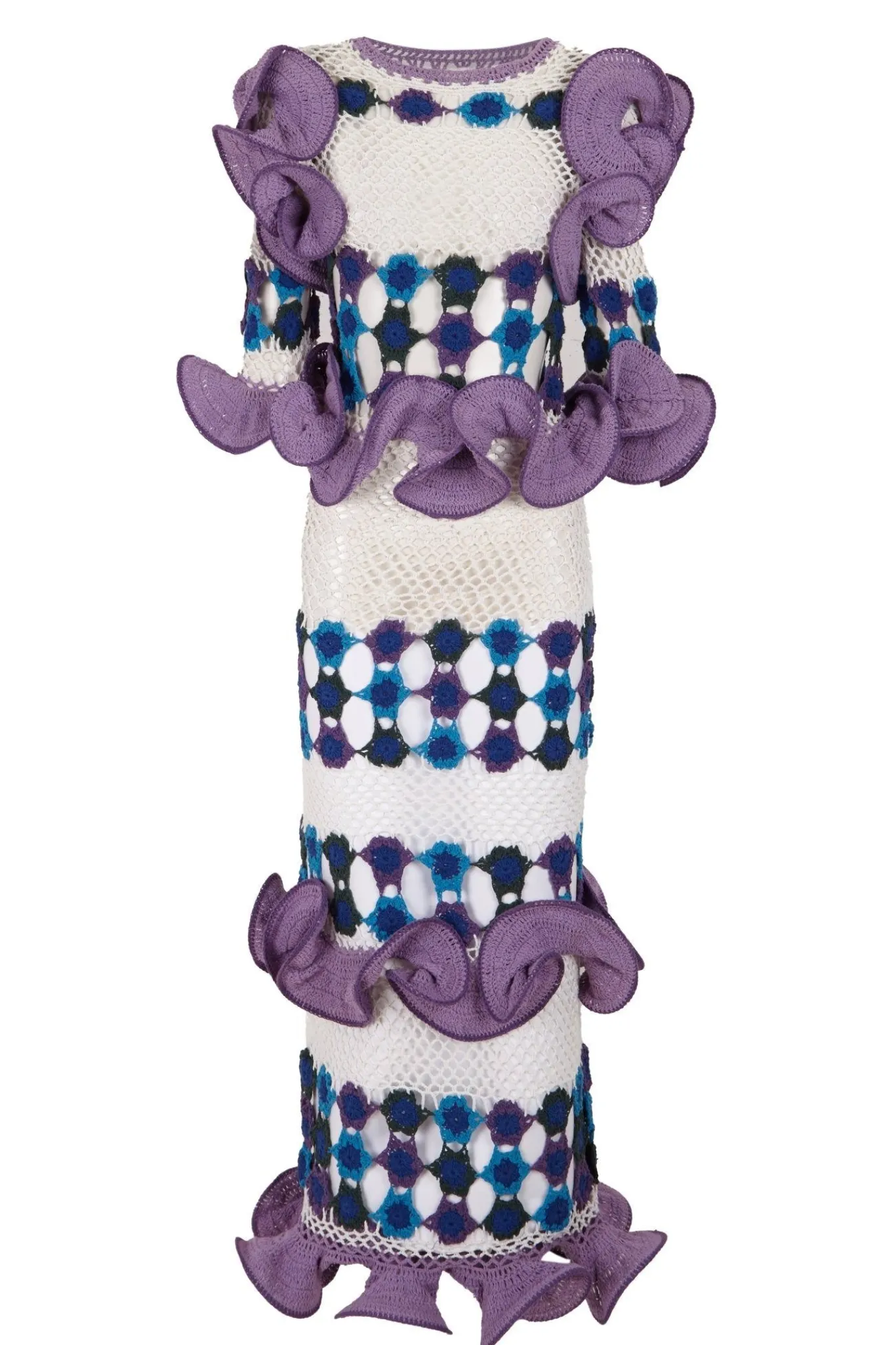 You’Ll Be Sure To Look Sexy, Original And Bold In Our Legacy Dress At Any Event This Season! With A Fishnet Base And Blue Flowers Throughout, The Purple Ruffles Adorning The Waist, Shoulders, Arms And Bottom Of The Piece Make This One A Stand-Out!