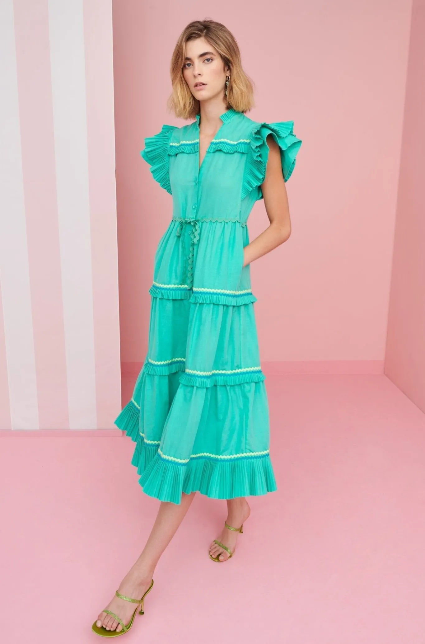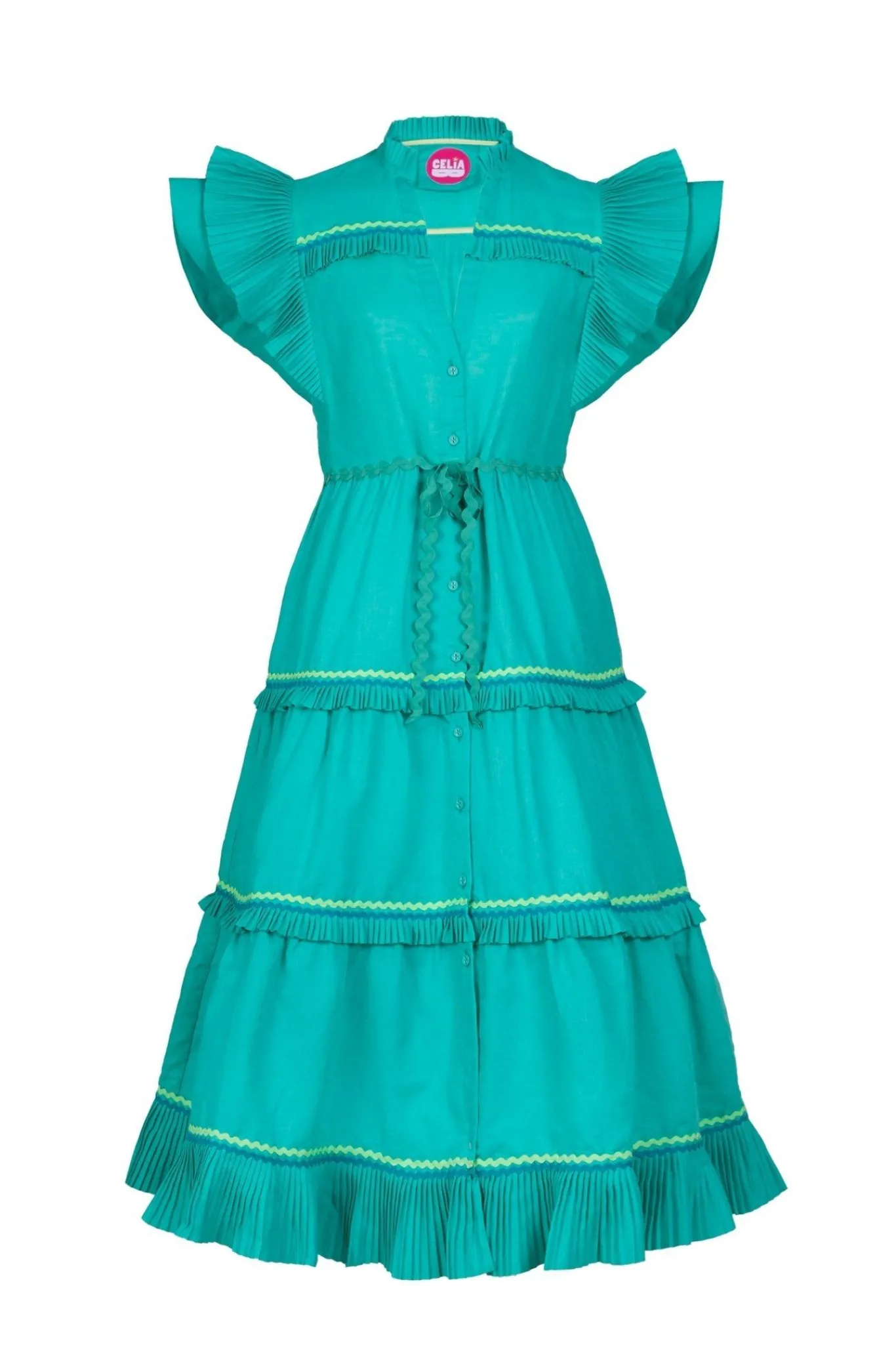 A Classic Summer Staple, This Midi, Short-Sleeved, Ruffled Blue Dress Is Perfect For Any Day Event. The Button Down Feature And Adjustable Waist Allow You To Play With The Structure Of The Dress, So That It’S Perfect For You!