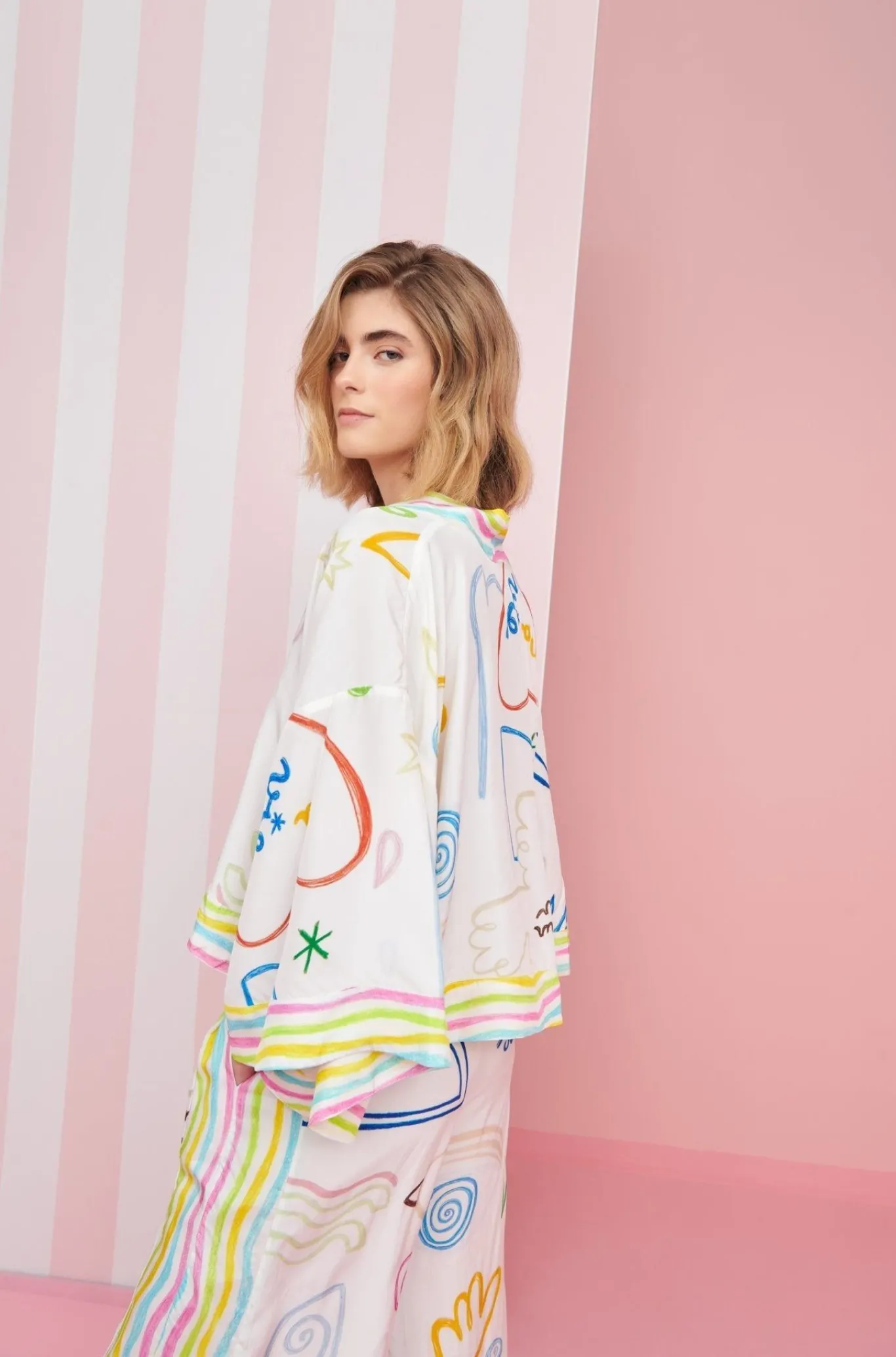 Want To Lounge By The Pool With Cocktails On Hand But Have No Outfit? We’Ve Got Just The One. Our White, Loose Fitted Nebula Pants, With This Season’S Colorful Star Print, Paired With Yellow Scalloped Detailing Are The Pant You Are Looking For. Want Even Better News? We’Ve Got The Matching Shirt Too!