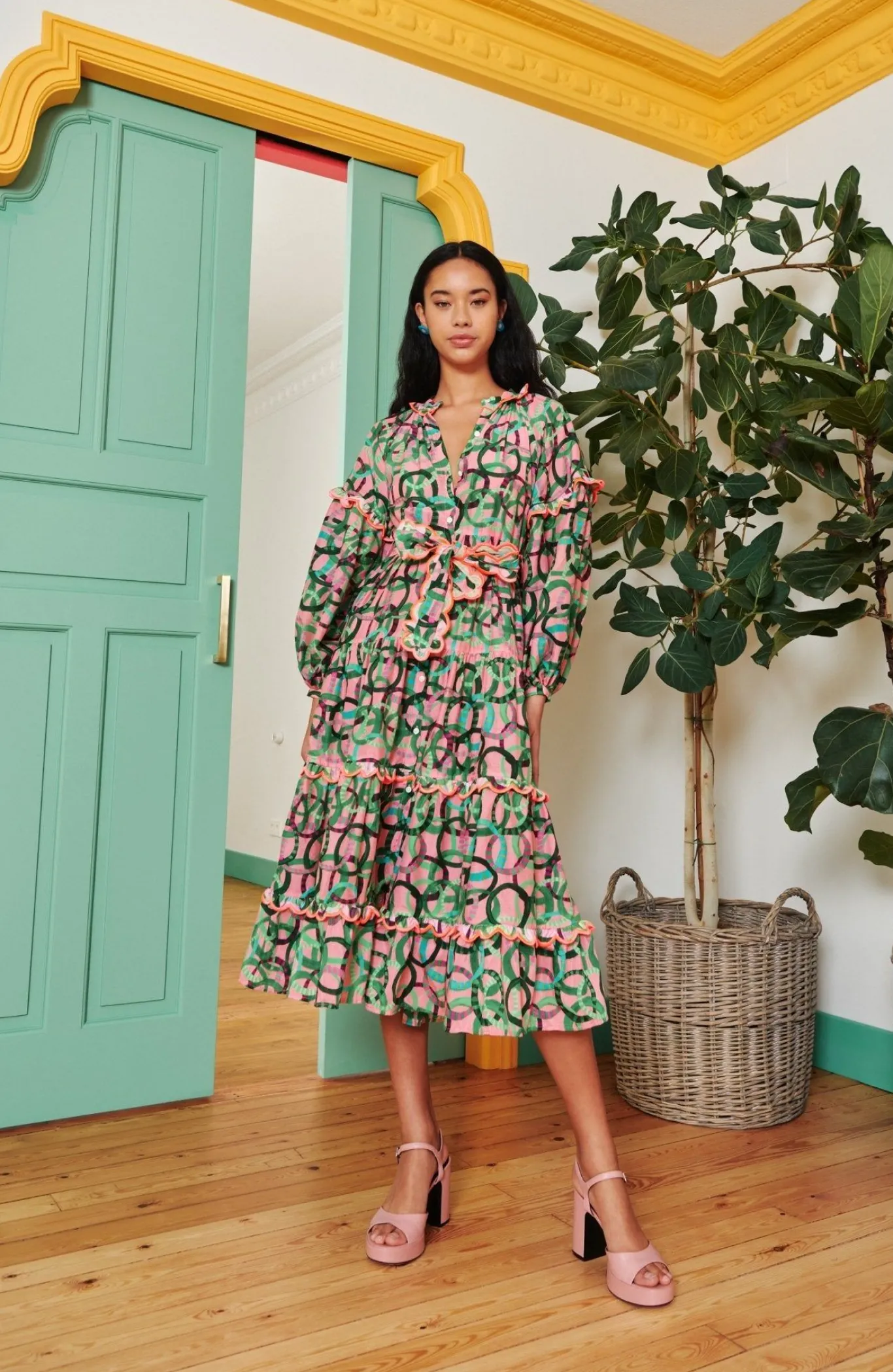 Green And Pink Circle Printed Midi Dress, A New Silhouette In A Relaxed Fit With Billowing Sleeves And Self Tie Belt. This Timeless Piece In A Silk And Cotton Blend Can Take You From Day To Night.