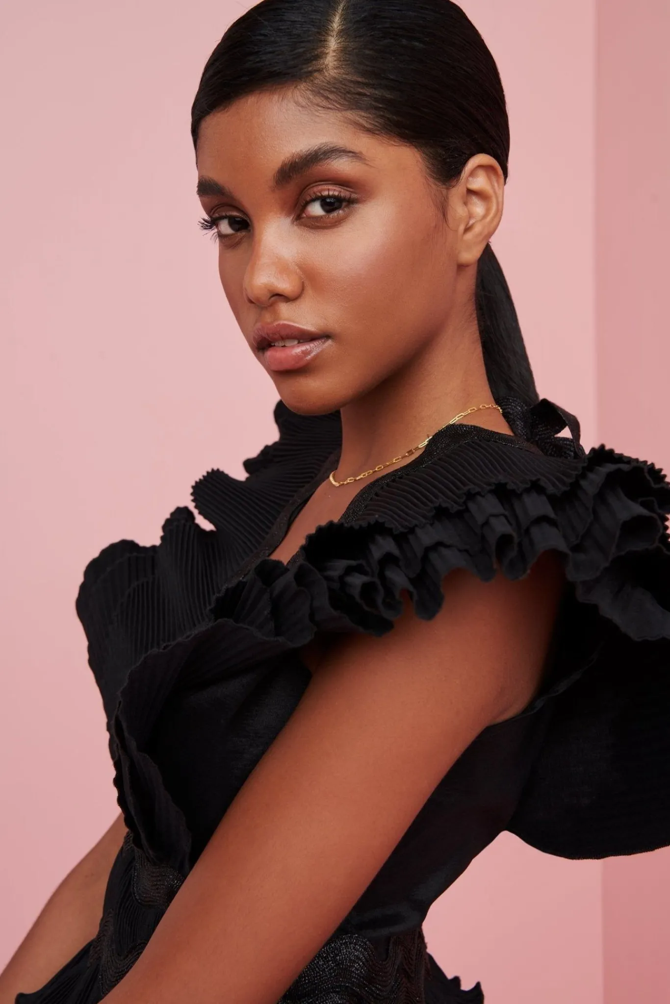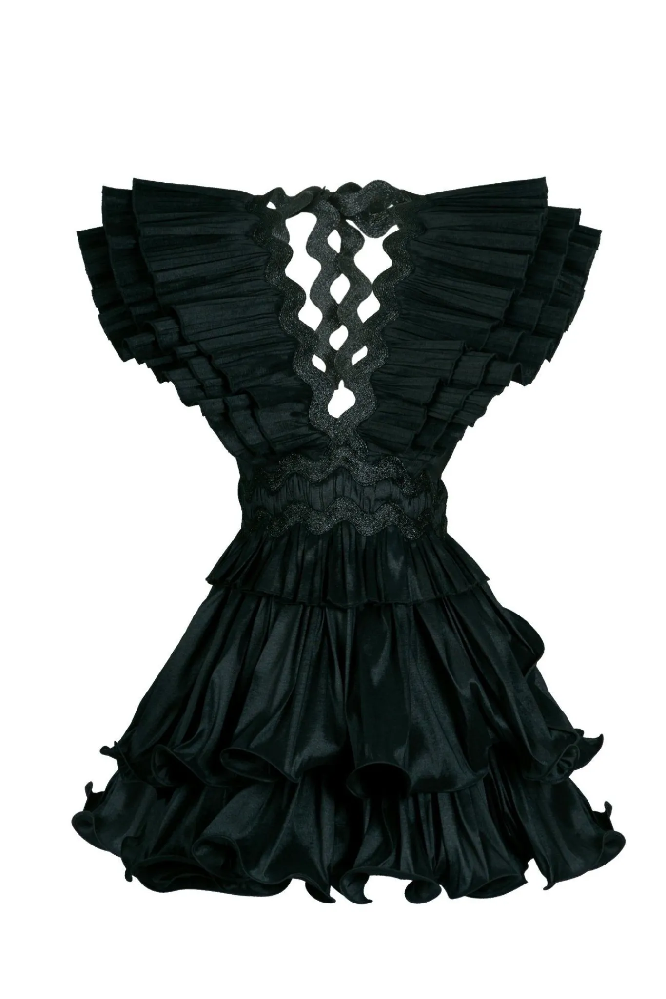Everyone Needs A Little Black Dress. This Season, With A Plunging V-Neck, Paired With Ruffled Short Sleeves And A Short, Voluminously Layered Skirt. Playful And Sexy All At Once!