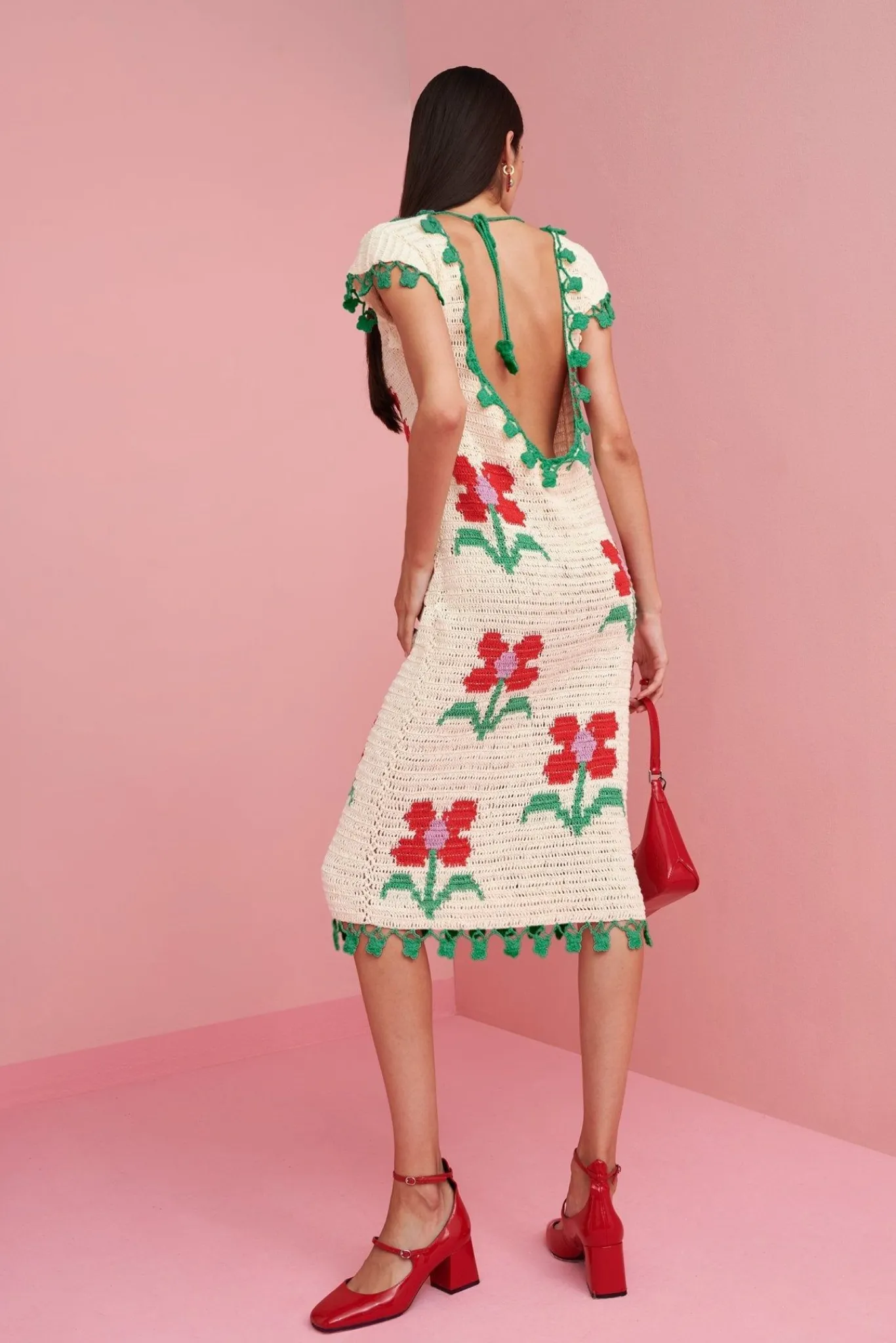 Midi Off-White Crochet Dress With A Red Flower Daisy Print Through Out. It’S Short Sleeves And Open Back Make This The Perfect Breethable Dress For A Any Warm Summer Event. The Bateau Neck And Fringe-Flower Details Are The Perfect Finishing Touches For The Dress!