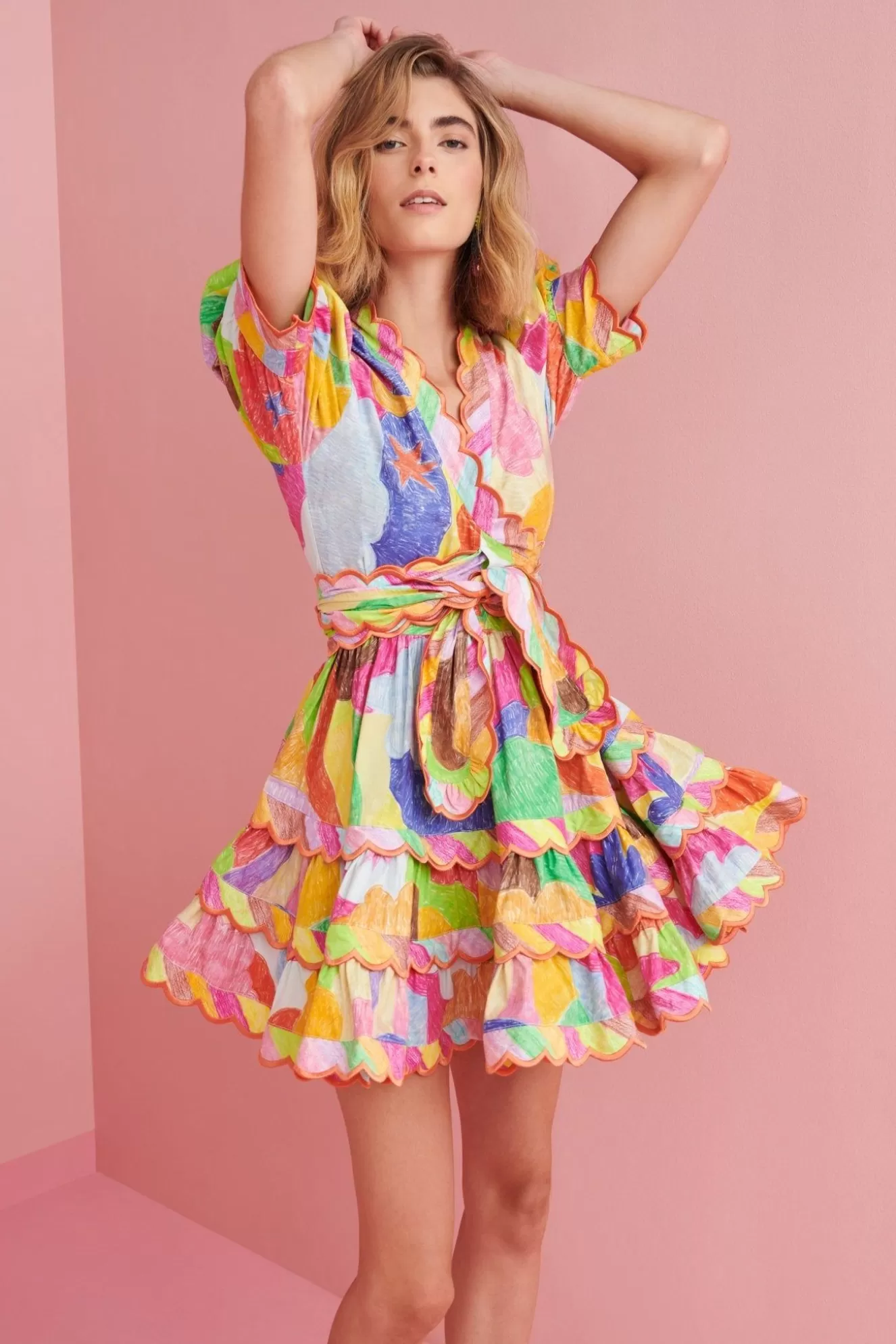 Colorful Printed Mini Dress, Featuring Puff Sleeves, A Belt And Our Characteristic Scalloped Edges. This Piece Is The Height Of Summer Fashion Fun!
