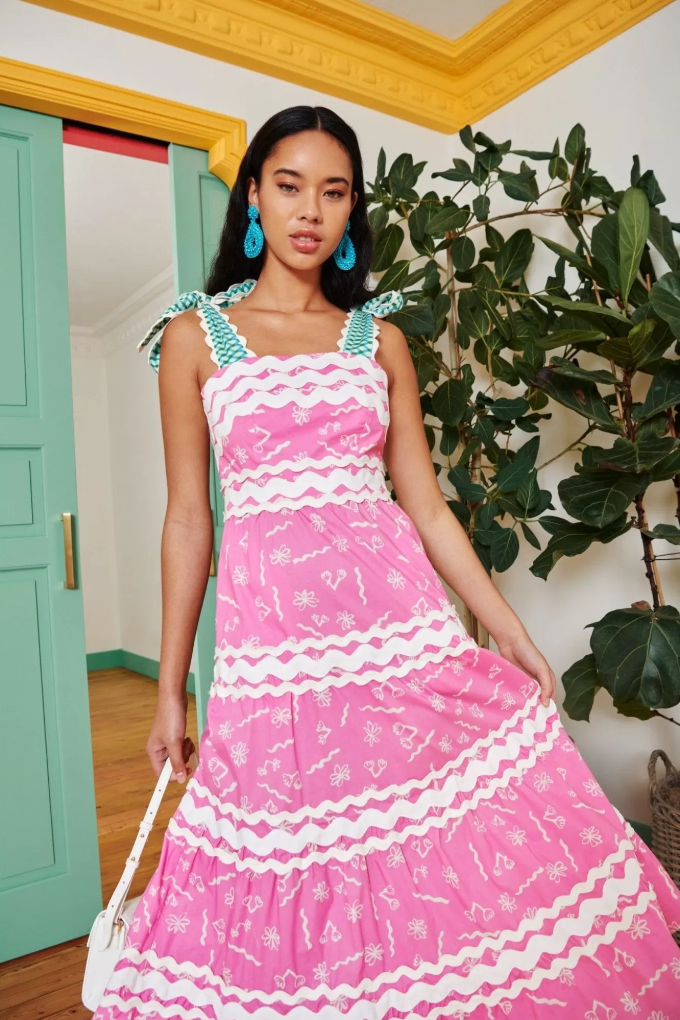 Midi Dress With Adjustable Tie Shoulder Straps And Back Zip Closure. This Whimsical Dress In Constrating Colors With Zigzig Trim Will Be A Favorite All Summer Long.
