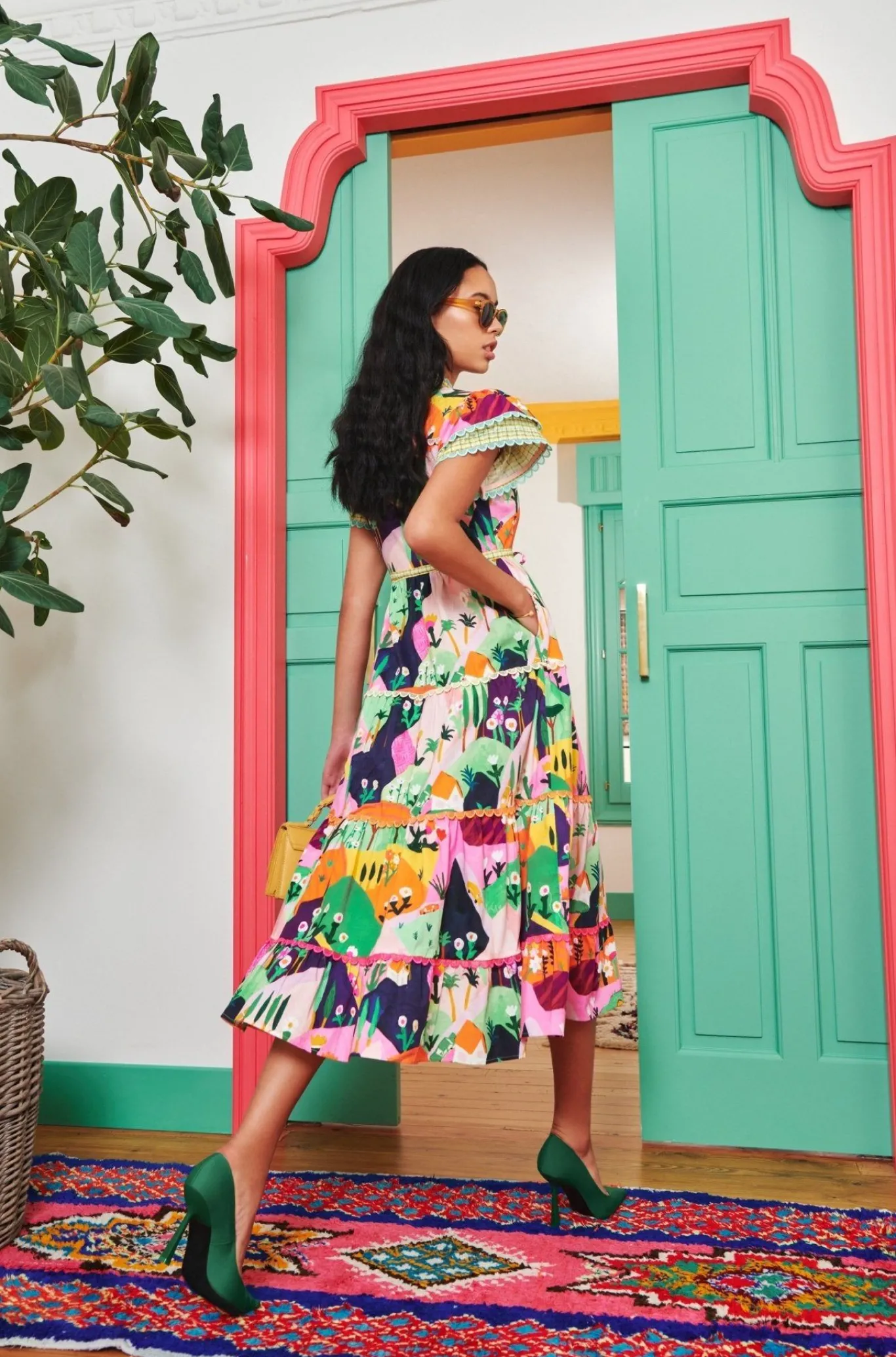 Our Best Selling Shape In A Novelty Landscape Printed Midi Dress Made From A Recycled Cotton Blend. Scalloped Trims At Sleeves And Skirt With An Easy Drawstring Tie Create A Flattering Silhouette.