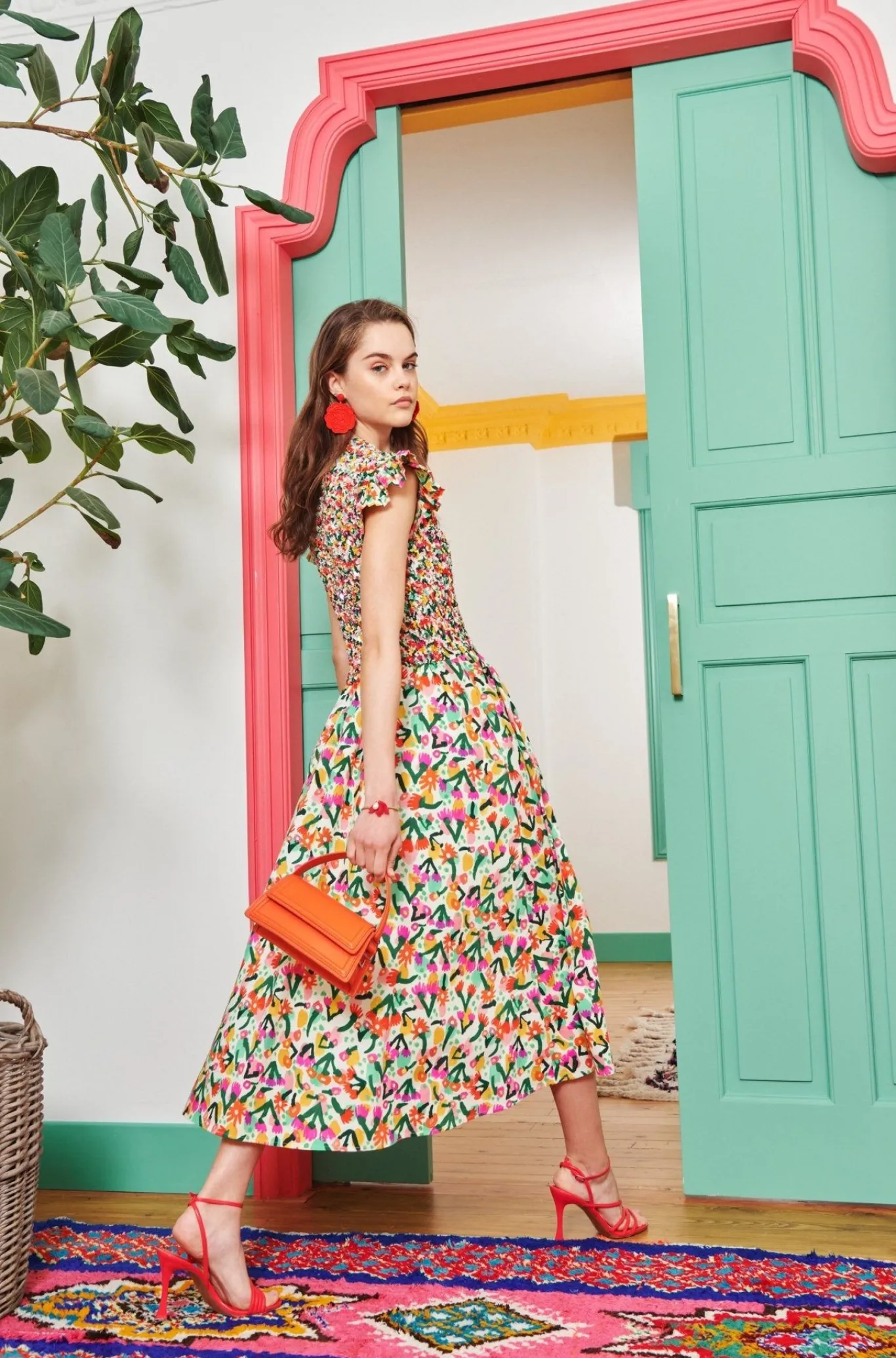 Midi Dress With A Smocked Bust And Tonal Sequins For A Bit Of Sparkle. Pleated Ruffle Detailing At The Shoulder And A Flowy Skirt Give The Dress A Romantic And Feminine Feel. This Dress Is Versatile And Can Be Worn For Any Occasion, From Brunch With Girlfriends To Date Night.