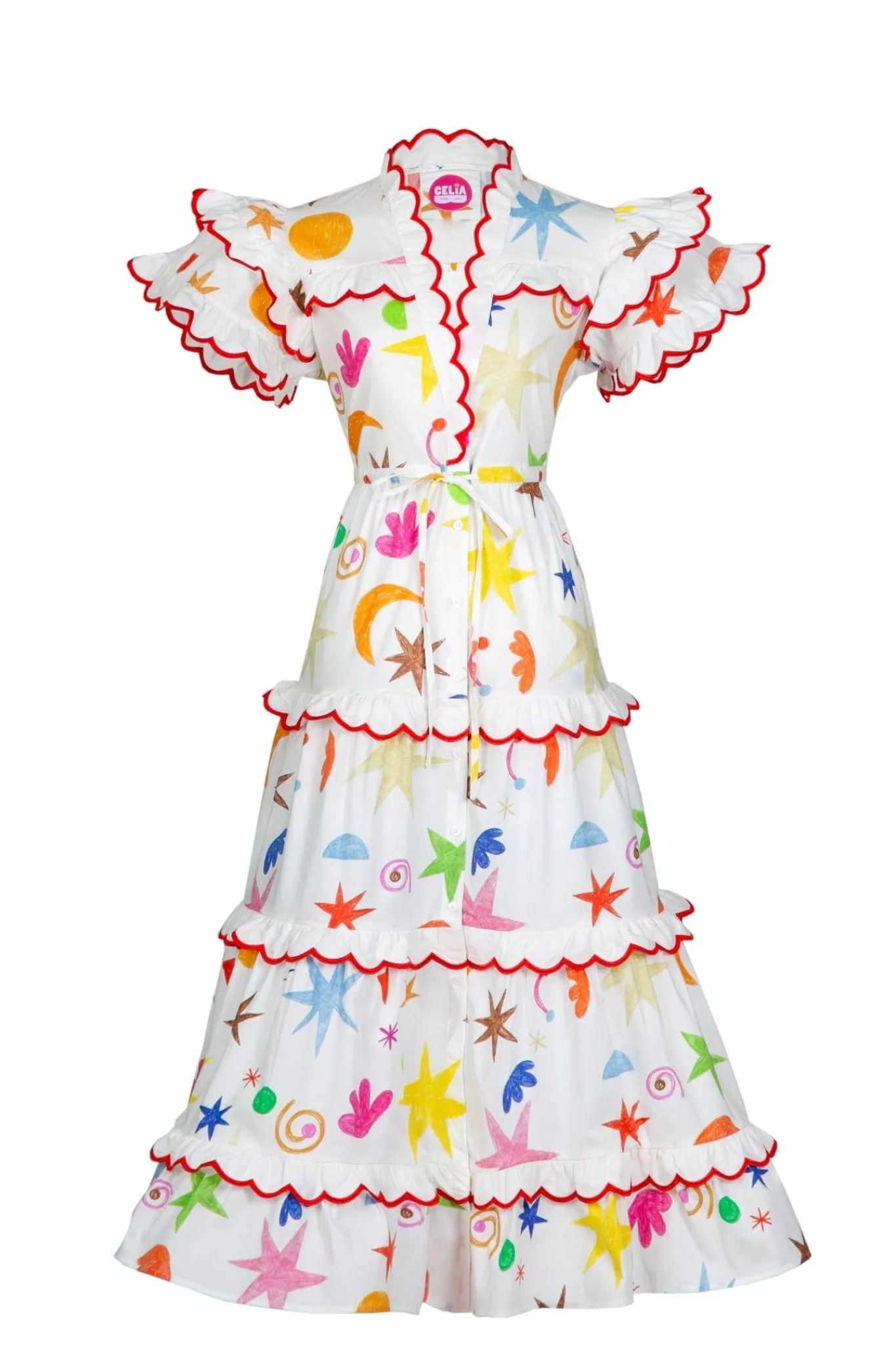 A Celia B Classic Shape, The Elysium Dress Is A Midi, Short-Sleeved Ruffled Staple Dress. With Buttons Running Down The Front And An Adjustable Waist, This Makes For The Perfectly Form Fitting Afternoon Piece. Our Signature Scalloped Edges Can Be Found Throughout The Dress. This Piece Counts With A Unique Colorful Sun Print, Paired With Pink Details On The Sleeves And Ruffles !