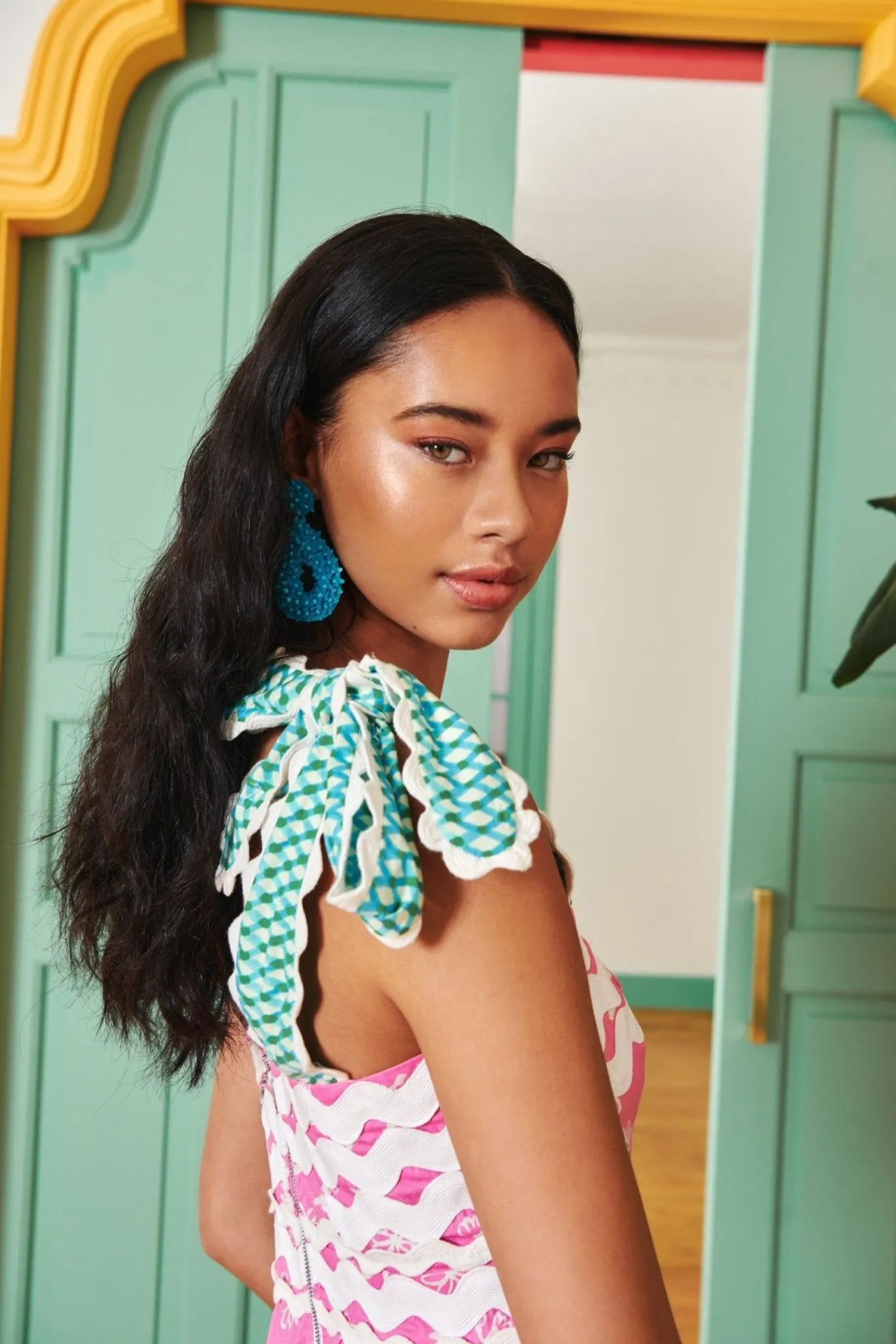 Midi Dress With Adjustable Tie Shoulder Straps And Back Zip Closure. This Whimsical Dress In Constrating Colors With Zigzig Trim Will Be A Favorite All Summer Long.