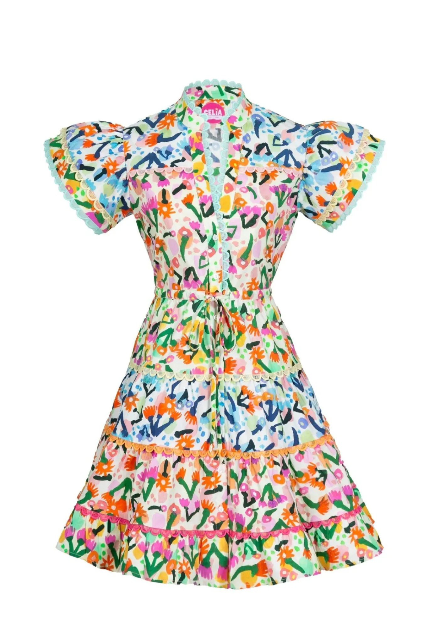 Made From A Recycled Cotton Blend, A Fun Floral Printed Mini Dress With Different Background Colors At Each Tier. Scalloped Trims At Sleeves And Skirt With An Easy Drawstring Tie, The Perfect Playful Look.